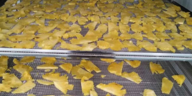 切好的菠蘿片進入熱泵烘干系統里烘干的過程,可以分成5段完成,一段,烘干,不除濕,時間1.5個小時,內外溫度一致,溫度50度,二階段,溫度53度,開始連續除濕,除濕到40%,第三階段溫度58度,連續除濕,濕度26%,第四階段溫度55度,濕度20%,連續除濕,第五段溫度48度,濕度18%,連續除濕1小時,烘干完成。