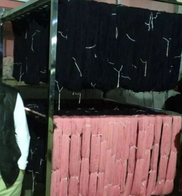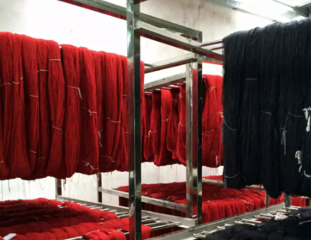 2:一車間的大姐非常認真把紗線均勻的掛在不銹鋼的物料架上,她說,今天還有很多批紗線將陸續(xù)染好顏色,等待烘干出貨。